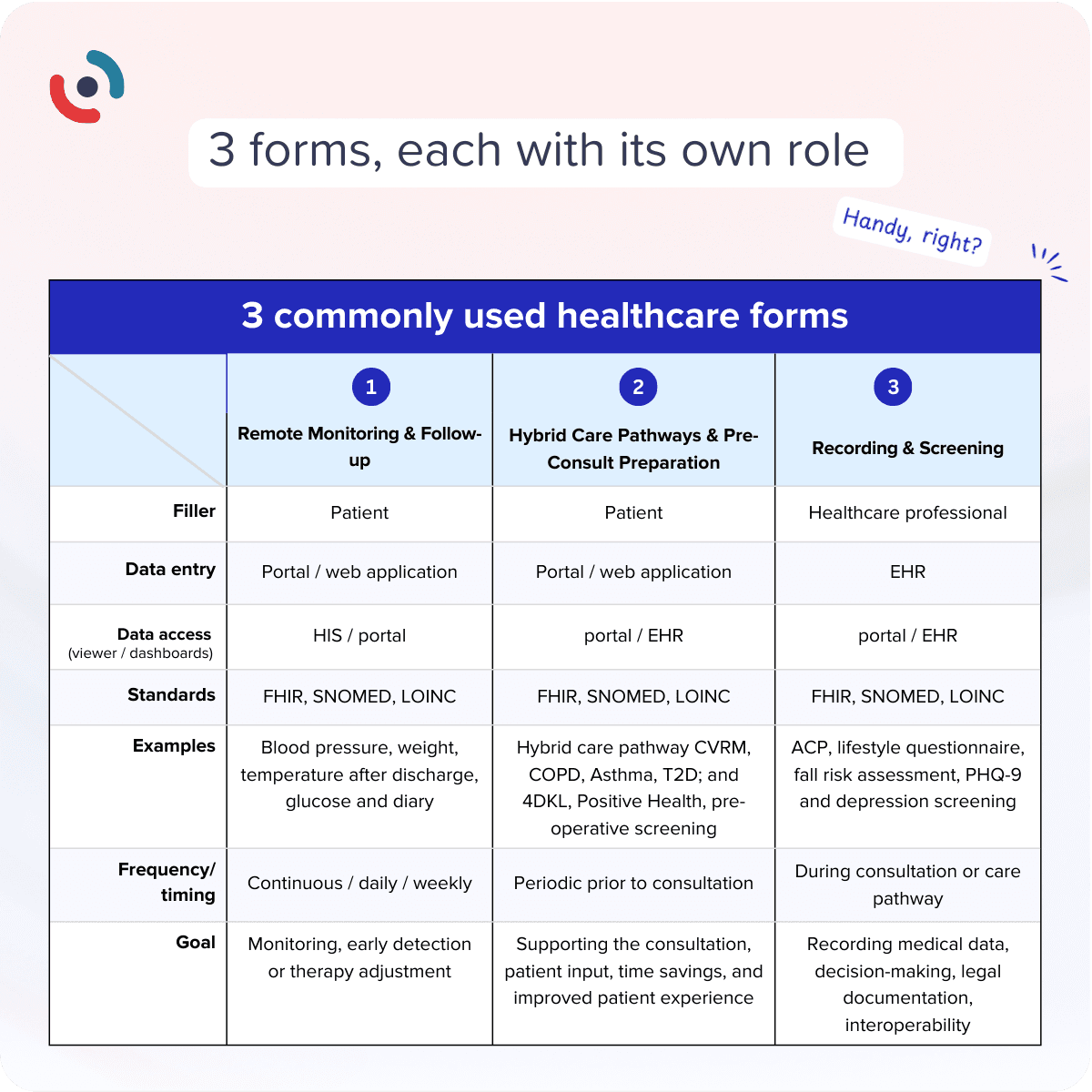 Digital forms have become a cornerstone of modern healthcare workflows. Yet not all forms serve the same purpose. In practice, we see three distinct roles: remote monitoring, hybrid care pathways, and clinical documentation & screening. Each type supports a different moment in the care journey—and when used correctly, they significantly reduce administrative burden while improving clinical insight. In this article, we explore these three ways to deploy healthcare forms and how they complement each other within interoperable care environments.